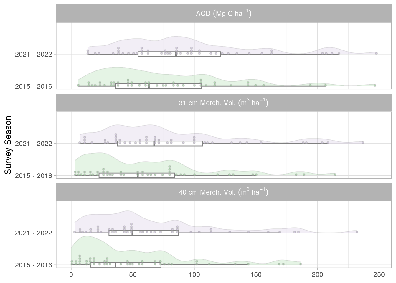 These plot-level values are vital for the further steps in the pipeline, allowing us to develop a strong empirical understanding of forest dynamics at these plots between sampling periods. Figure 6.1 presents these data for three different metrics; Aboveground Carbon Density (ACD), and Merchantable Volume for trees with a DBH > 31cm and 40cm. In All cases we see mean growth when considering the full distribution of plots.