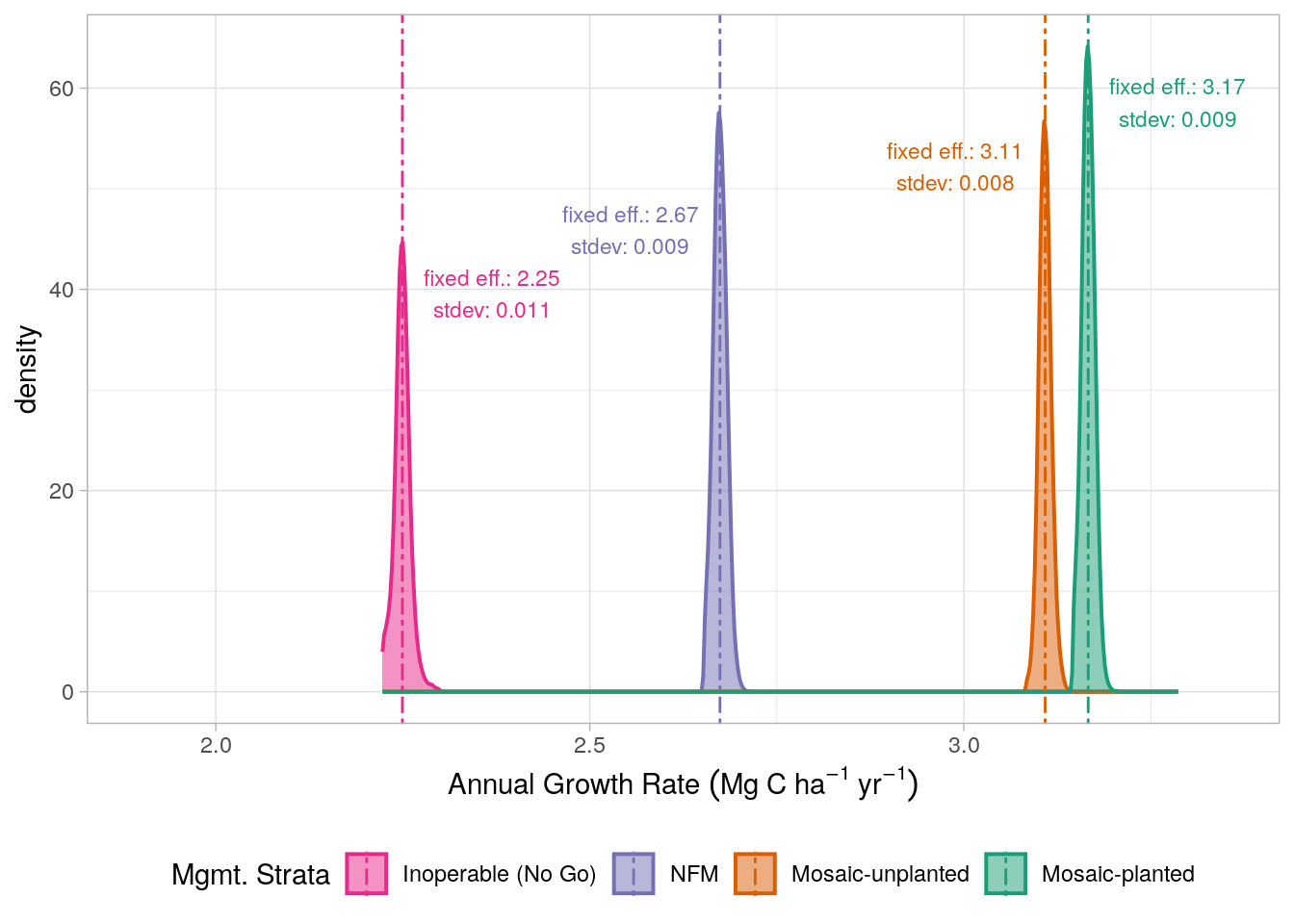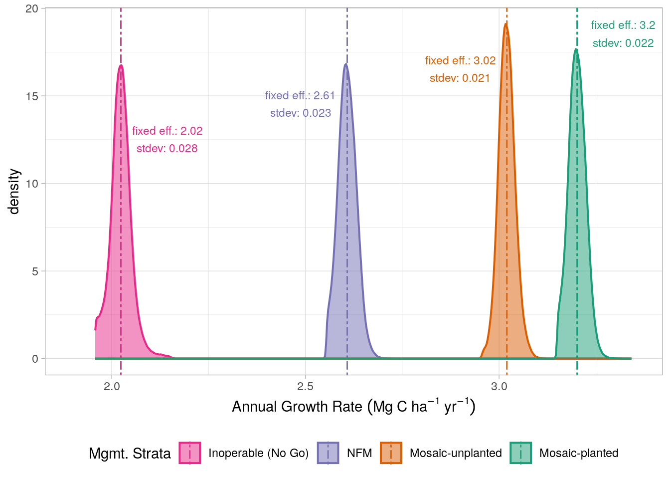 To determine the variability in growth rates, for each strata, we extracted the model’s random effects (for each pixel that intersected the relevant strata) and added the fixed effect slope, providing model coefficients defining growth for each pixel in the project area. The distribution of these slope coefficients are presented in Figure 17.2. These distributions also enable us to make estimates of the uncertainty in growth rates across the project area for each strata; this is demonstrated in Chapter 18 (Figure 18.3).