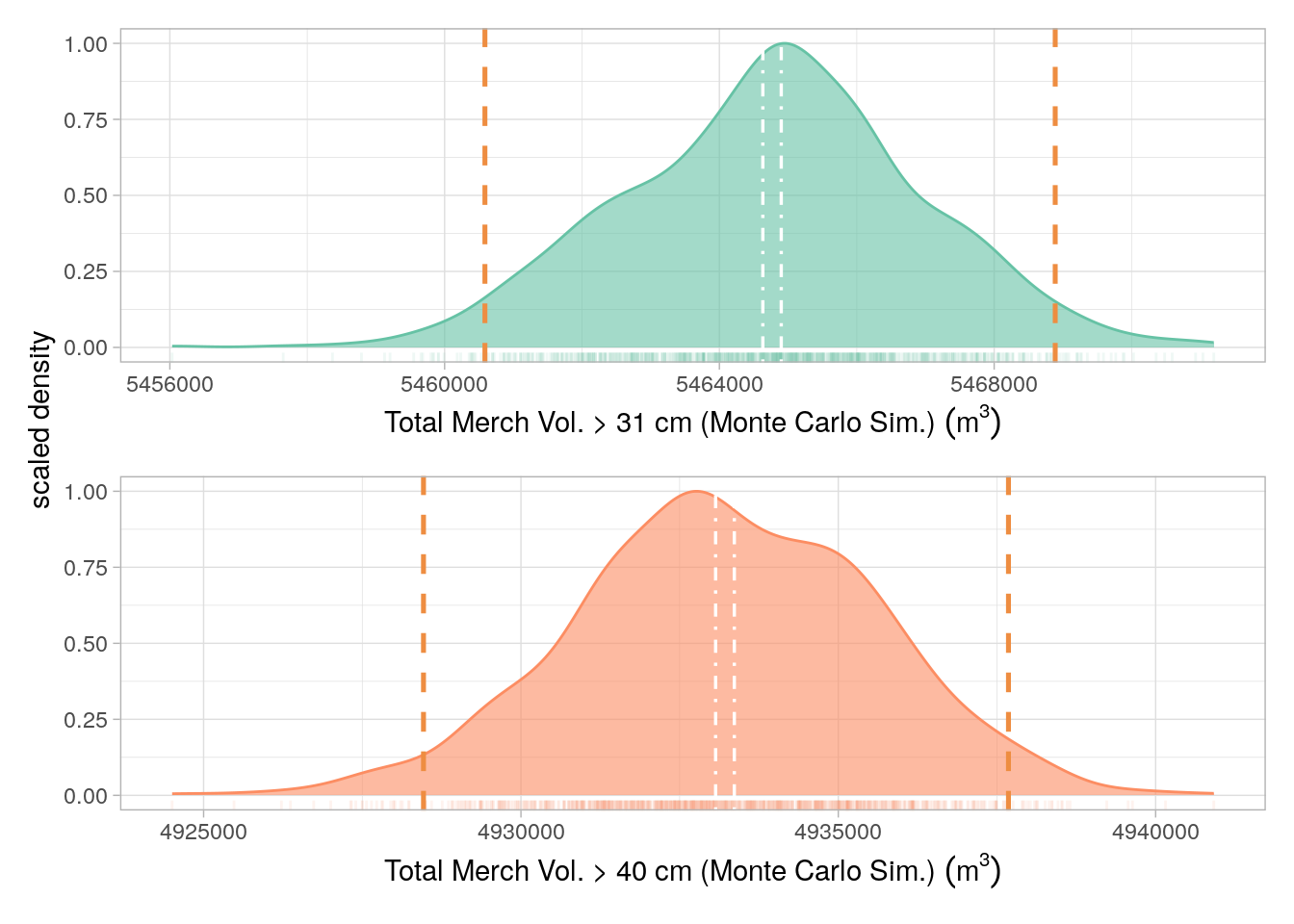Uncertainty limits for TMV were derived as follows: Volume maps were masked to the project area, values from all three bands (mean, lower Prediction Interval (PI), upper PI) were converted to a dataframe. A simulation consisting of 10000 iterations was carried out, for each iteration, 100 random samples were drawn, for every cell, from a normal distribution, centered around the cell mean and constrained by the upper and lower 95% PI values. All cell values for every simulation (n= \(1e{+6}\)) were summed to give a simulated total; The 0.025th and 0.975th percentiles of the distribution were calculated and used as the PIs.