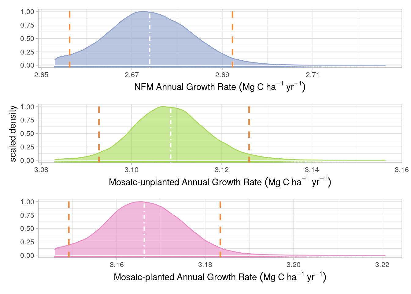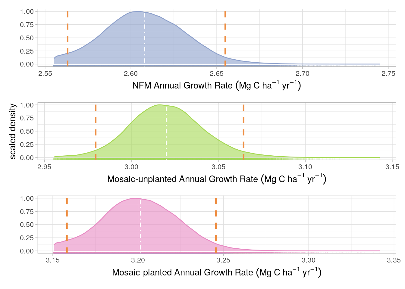 Uncertainty limits for the Project growth rate were derived from the fixed effects slopes of a linear mixed-effects (LME) model as described in Figure 17.2. Pixel ID was used as a random effect in the LME model and therefore we could generate a slope value, for each pixel, by summing the fixed effect (for the management strata intersecting the pixel) and the random effect. The distribution of these coefficients around the fixed effect value for each management strata was used to estimate growth rate uncertainty. Although the No-Go strata was included in the LMEM, it was not included in the uncertainty analysis because no credits are generated from the No-Go strata. As with the Volume uncertainty, the 0.025th and 0.975th percentiles of the slope coefficient distributions, for each management strata, were calculated and used as PIs